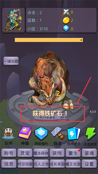 1、击败怪物可获得【铁矿石-1】,积累层数进度解锁更多功能,提升实力为后续挑战打基础。