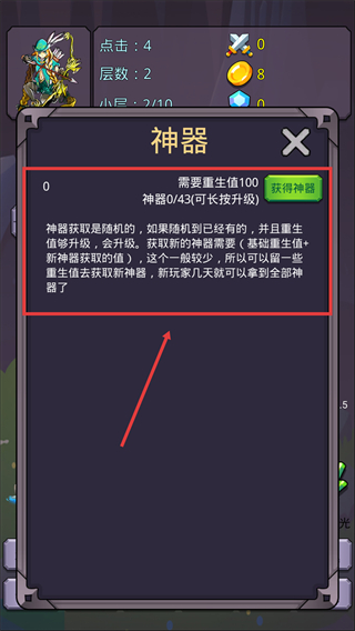 3、神器获取需【重生值-100】,随机获取可升级已有神器,留部分重生值拿新神器提升战力。