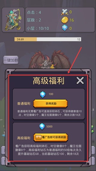 4、领取高级福利中普通福利可直接得【钻石-100】等奖励,积累徽章提升属性助力快速成长。