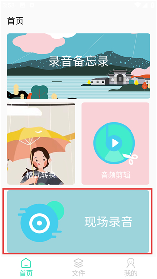 1、在应用首页找到【现场录音】功能入口,点击即可进入录音界面,开启录音任务的第一步操作。