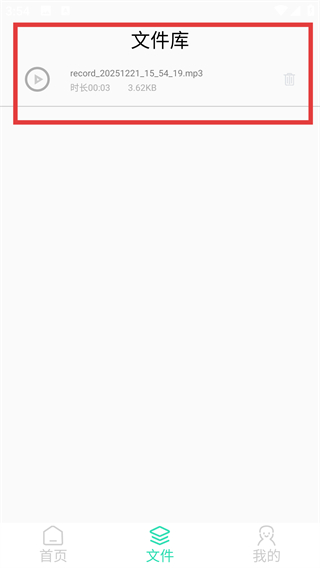 4、保存的录音会出现在【文件库】中,可查看录音时长、大小,支持播放或删除操作。