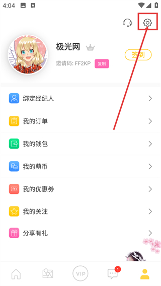 2、在个人中心页面,点击右上角的【设置】图标,即可进入设置界面进行账号相关功能的操作。
