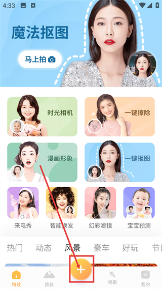 1、在奶酪相机主界面,点击底部【+】按钮,可进入特效选择页面,开启时光相机、一键擦除等功能体验。