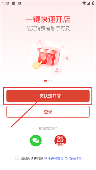 1、进入应用后,点击【一键快速开店】按钮,勾选协议并选登录方式,即可启动开店流程,轻松触达亿万消费者。
