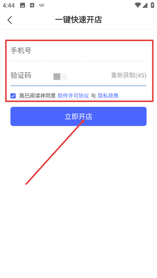 2、在开店流程中,填写【手机号-验证码】,确认协议后点击【立即开店】按钮,快速推进开店步骤,高效便捷。