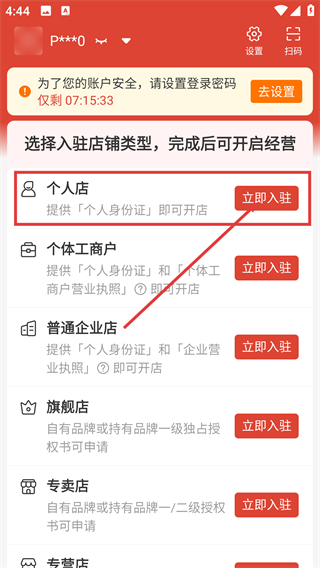 3、选择【个人店】类型,点击右侧【立即入驻】按钮,仅需提供个人身份证即可开店,开启经营之旅。