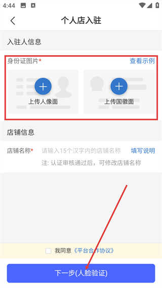 4、进入个人店入驻页面,上传【身份证图片-人像面-国徽面】,填店铺名后点【下一步(人脸验证)】完成提交。