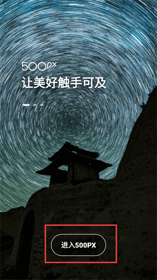 1、打开应用,点击【进入500PX】按钮,即可开启摄影作品的探索之旅,接触全球优质影像内容。