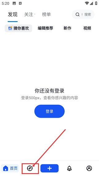 2、在【500px】首页,点击底部带图标的按钮,进入探索界面,浏览各类摄影作品及分类内容。