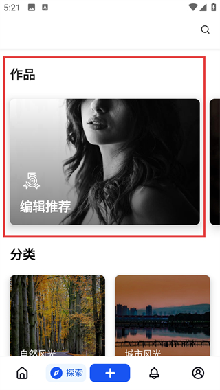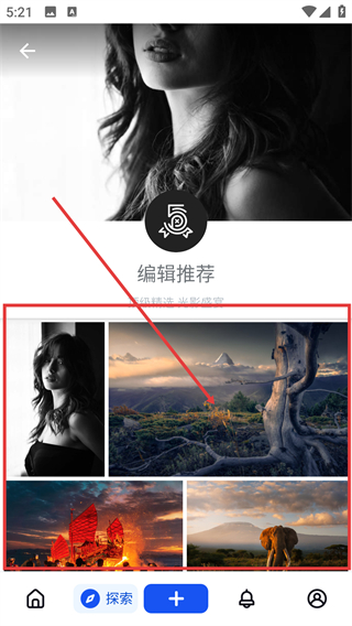 3、进入探索页后,点击【编辑推荐】板块的作品,查看精选摄影内容,感受专业影像的独特魅力。