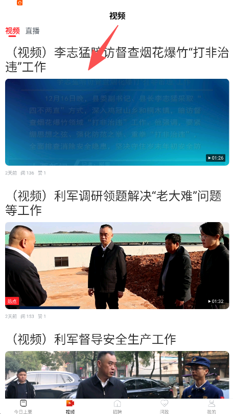 2、在视频列表页选择目标新闻视频如“利军调研领题解决‘老大难’问题等工作”。