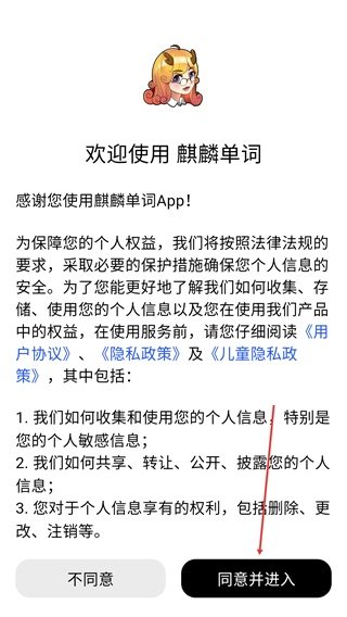 1、阅读【麒麟单词】的欢迎弹窗,点击【同意并进入】。