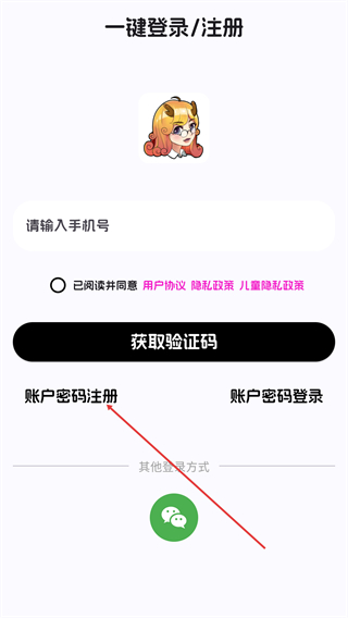 2、在【一键登录/注册】页,选择【账户密码注册】。