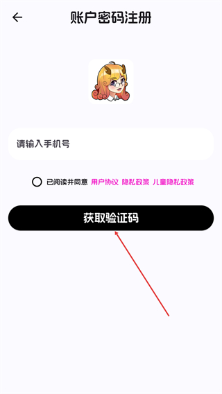 3、进入【账户密码注册】页,输入手机号并勾选同意协议,点击【获取验证码】按钮。
