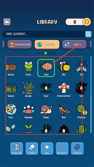 3、进入【LIBRARY】界面后,在【NATURE】分类下可选择【FISH】等元素,底部【CLEAR-ALL】等按钮能辅助管理元素。