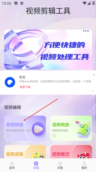 2、在剪辑页,点击【视频拼接】选项,进入相机胶卷的视频选择页面。