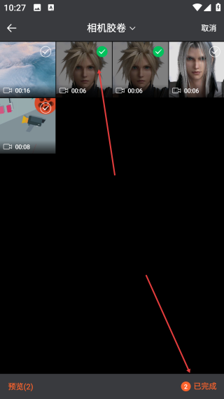 3、在选择页,选中【目标视频】点击【已完成】,进入视频拼接的编辑页面。
