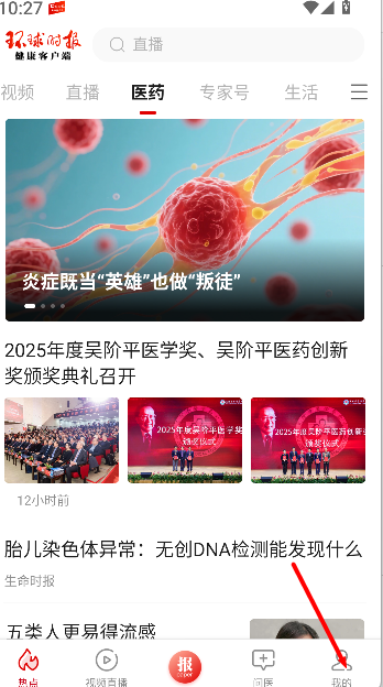 1、打开《环球时报健康》应用,在首页界面点击右下角“我的”,进入个人相关功能页面,查看账号与常用设置入口。