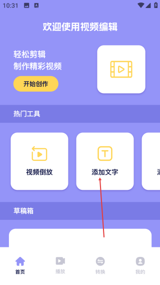 1、进入首页后,点击【添加文字】选项,进入视频编辑的功能选择界面。