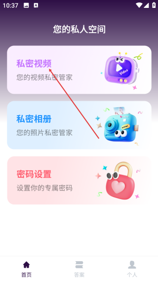 1、进入私人空间页,点击【秘密视频】选项,进入密码设置的操作界面。