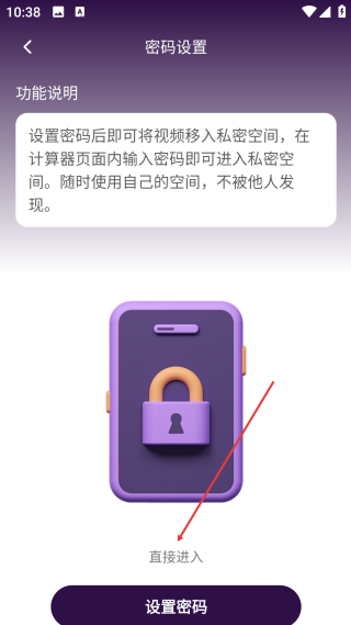 2、在密码页,点击【直接进入】,进入秘密视频的管理页面。