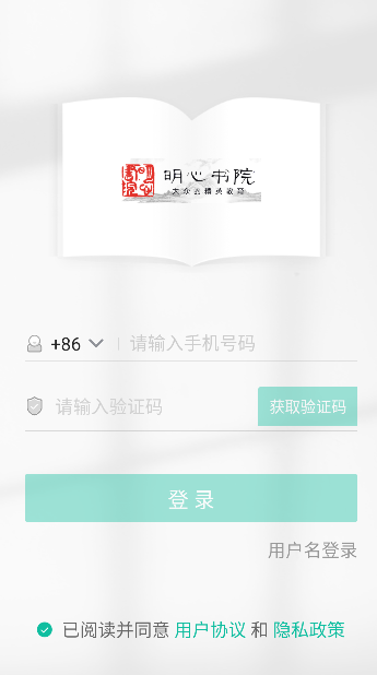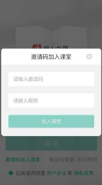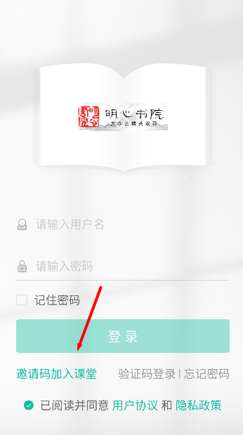1、打开《明心书院》应用,在首页界面点击“使用邀请码进入课堂”,进入课堂登录与验证页面。