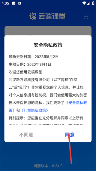 1、打开云端课堂APP后,阅读《安全隐私政策》,点击【同意】按钮以进入登录界面。