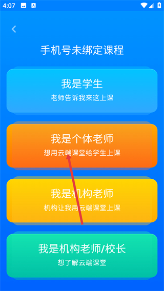 3、登录后进入手机号绑定课程页面,选择对应身份(如“我是个体老师”),进入信息填写界面。
