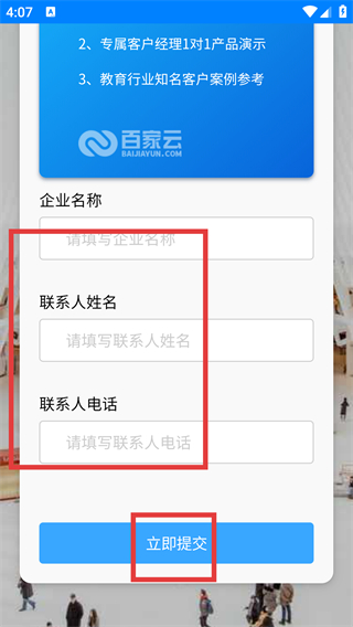 4、在信息填写界面,输入企业名称、联系人姓名等信息后,点击【立即提交】完成绑定流程。