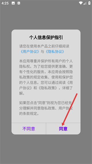 1、打开只语打字训练APP后,阅读《个人信息保护指引》,点击【同意】按钮进入登录选择界面。