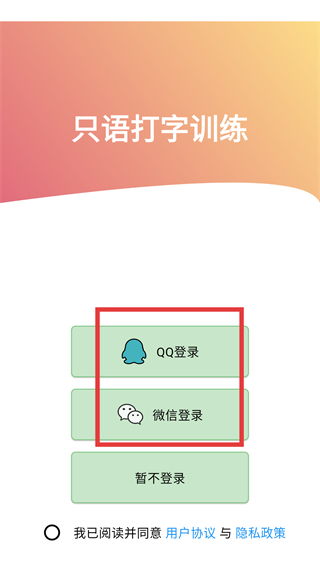 2、在登录界面可选择QQ/微信登录,或点击“暂不登录”直接进入打字训练主界面。
