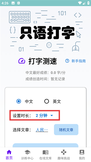 3、在主界面的打字测速模块,点击【设置时长】选项,可展开时长选择的弹窗。