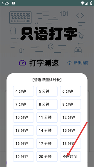 4、在时长选择弹窗中,可选择4分钟、不限时间等不同时长,自定义打字测速的训练时长。