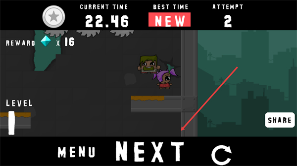 4、关卡结束后,可查看【CURRENT-TIME】和【BEST-TIME】,点击【NEXT】进入下一关,或选择【MENU】返回。