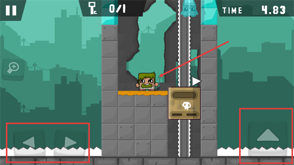 2、在关卡中,通过左右方向键控制角色移动,借助向上按钮跳跃,靠近带有骷髅标的箱子完成目标收集。
