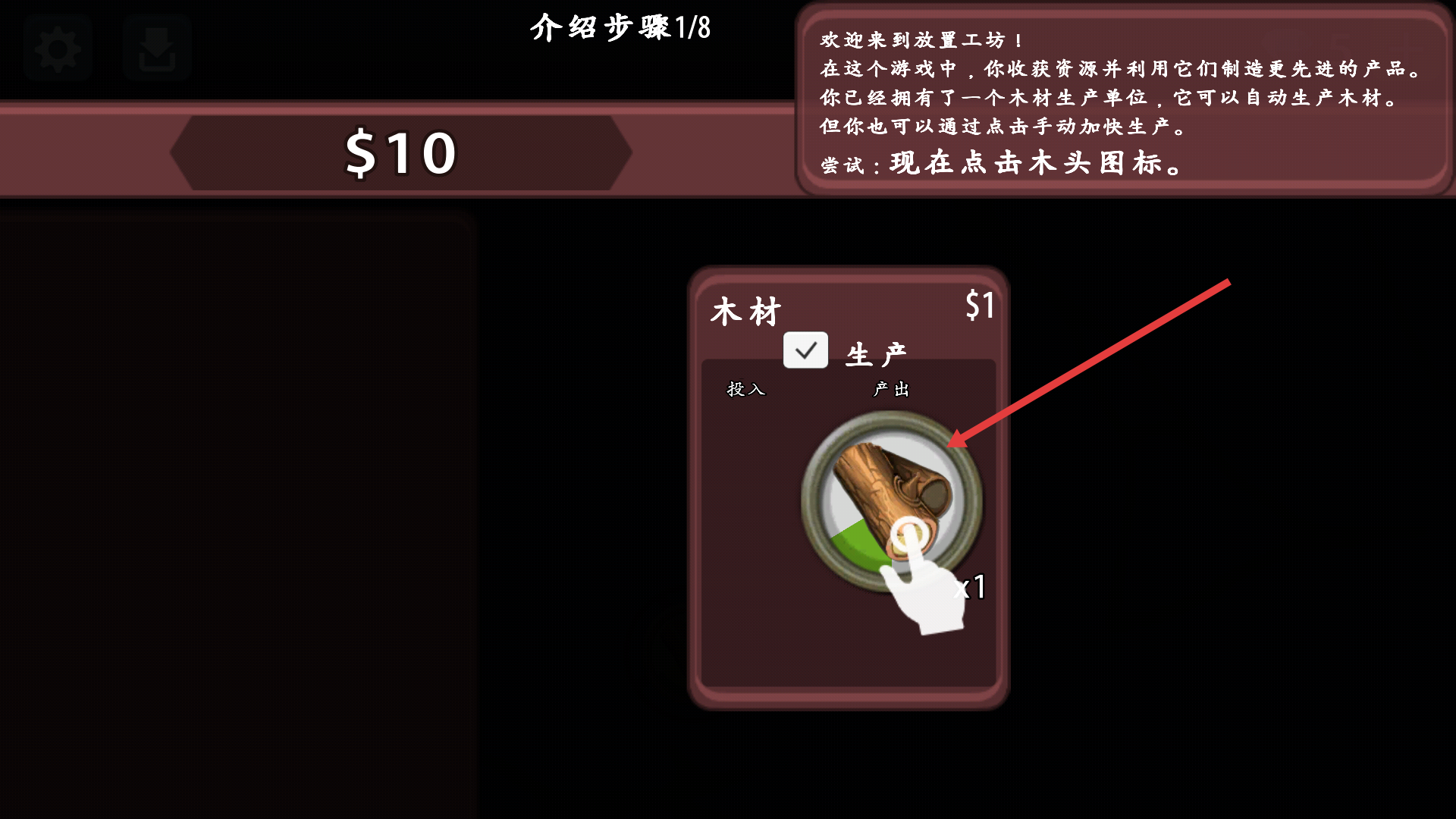 1、进入放置工坊后,点击【木材】图标,可手动加快其自动生产流程,获取基础资源。