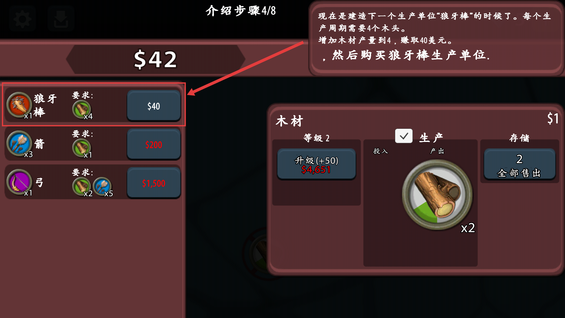 4、满足【狼牙棒】的资源(4个木材)与资金(40美元)要求后,点击对应按钮可解锁新生产单位。