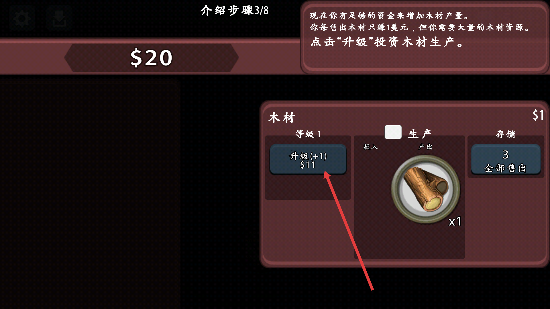 3、积累足够现金后,点击【升级(+1)】按钮,可提升木材的生产效率,增加资源获取速度。