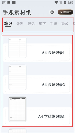 1、进入手账素材纸的【笔记】标签,可选择【A4-会议记录1】、【A4-学科笔记纸1】等模板,在顶部可切换不同的标签。