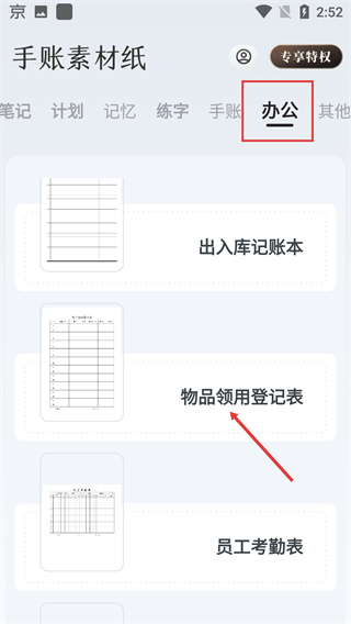 2、切换至【办公】标签,点击获取【物品领用登记表】的模板,适配职场办公类记录需求。
