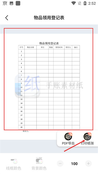 3、进入【物品领用登记表】详情页,可通过【打印纸张】、【PDF-导出】功能,实现表格的实体打印或电子存储。