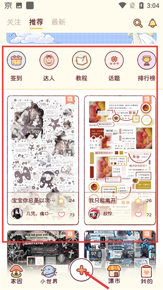 3、进入小世界板块,通过【签到】、【教程】、【排行榜】等入口参与互动,浏览推荐内容,可对用户作品进行点赞收藏。