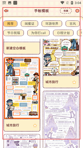 4、点击【+】按钮,进入手帐模板页面,选择【推荐】、【日程计划】等分类,使用【新建空白模板】或【城市旅行】等模板创建专属手帐。