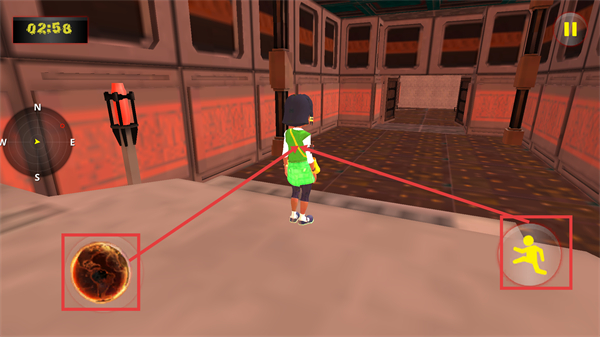 2、关卡内留意左上角的【02:58】倒计时,借助【N-E-S-W】方向标定位,操作【黄色小人图标】功能,同时互动场景中的球体元素。