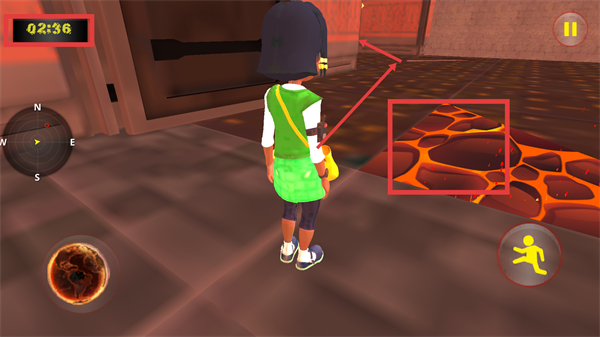 3、关注左上角的【02:36】倒计时,游玩过程中避开场景里的熔岩区域,朝着目标门的方向推进以规避危险。
