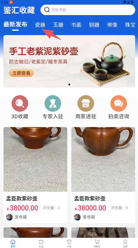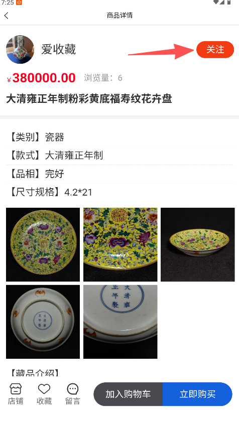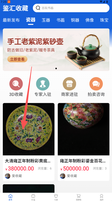 1、藏品展示方式丰富,支持高清细节图、360度旋转查看及专家对藏品的鉴赏文字说明。