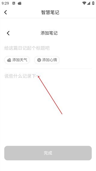 3、在添加笔记页,填写标题、内容等信息后,点击【完成】按钮提交笔记。