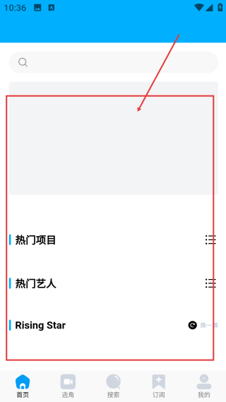 1、进入首页,可通过【搜索框查找内容,查看热门项目、热门艺人等板块的信息】。