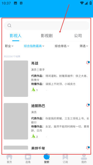 2、在搜索页面,选择【影视人】分类,查看【艺人的代表作品及综合排名情况】。