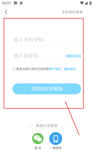4、在登录页面,输入【手机号与验证码勾选协议】,登录后可进入账号。